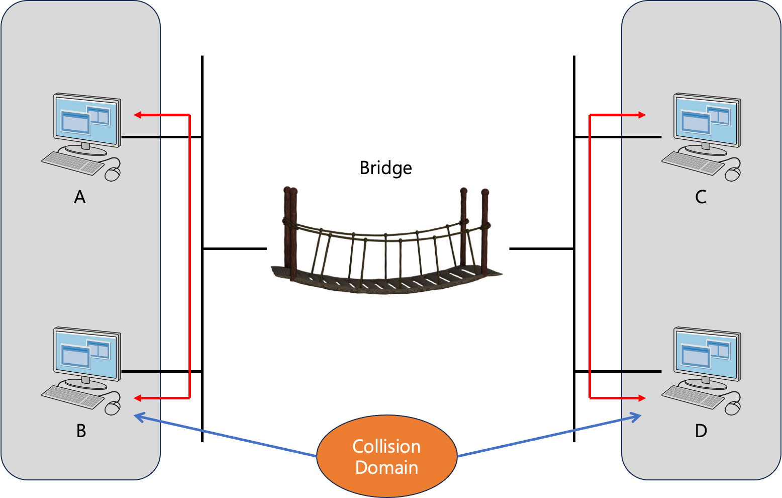 이렇게 네트워크 규모가 커지고 통신량이 증가할 때 콜리전 도메인을 나누어주기 위해 사용하는 장비가 바로 브리지나 스위치입니다. 브리지와 스위치는 서로 사촌 같은 사이입니다. 하는 일이 서로 비슷하죠.