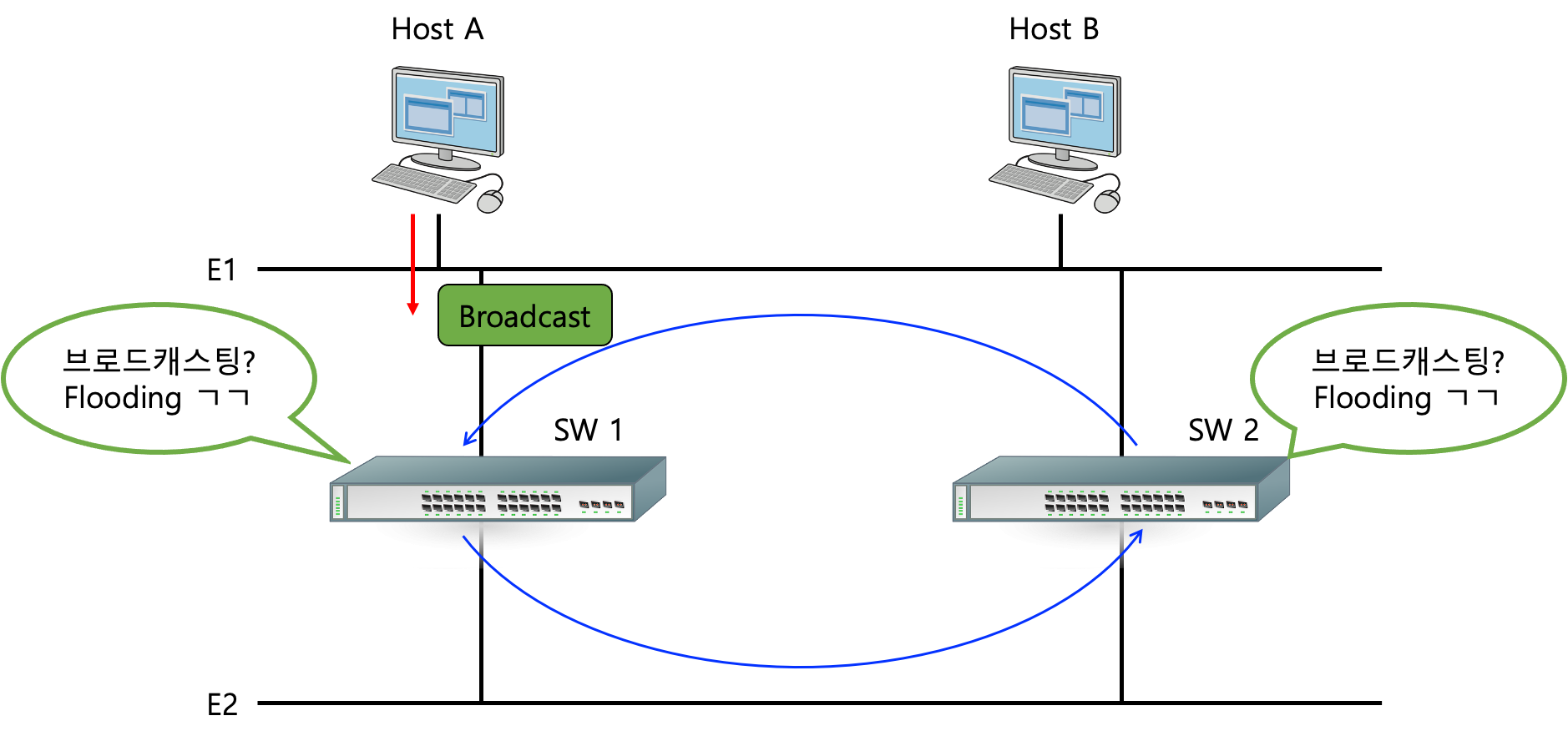 호스트 A가 브로드캐스트(Broadcast) 패킷을 보냅니다. 그럼 패킷은 세그먼트 E1에서 양쪽 스위치로 모두 전달될 것입니다. 그리고 2개의 스위치는 패킷을 보고 이 패킷이 브로드캐스트 패킷이라는 것을 알아낸 후 플러딩(Flooding)을 하게 됩니다. 그럼 세그먼트 E2로도 브로드캐스트 패킷이 보내지겠죠? 세그먼트 E2를 통해 다시 브로드캐스트 패킷을 받은 스위치 1과 2는 다시 위쪽 포트(세그먼트 E1)로 Flooding을 하게 됩니다.